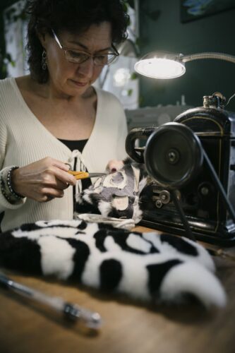 Though seals and sea otters are safeguarded under the Marine Mammal Protection Act, or MMPA, they are legally allowed to be harvested by Native Alaskans for the purposes of subsistence as well as for the creation of handicrafts. However, seal and sea otter fur may only be sold to non-Natives after it has been extensively altered to no longer resemble a whole pelt, such as by sewing it into a hat, purse, mittens or scarf (among other options). This is where Christy Ruby’s talent as an artist and fur fashion designer really shines: She has an exceptional eye for form and detail, meaning that her pieces are not only well made and highly serviceable, but unique works of art too. You won’t find any mass-produced items in her studio. Every piece she produces is carefully handmade and one of a kind.