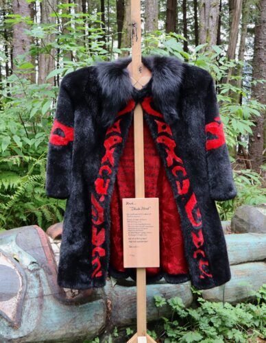 The ability to hunt and sell handicrafts is also a way for Native artists to continue to create beautiful clan art, as well as pass along tribal history and stories, something seen in many of Ruby’s clothing designs. One of her most notable pieces is the exquisite “Black Blood Coat,” a three-quarter-length fur coat consisting of 68 pieces of red- and black-dyed sea otter, with a custom-printed lining containing a poem that, translated into Tlingit, remembers the abused Native children of Alaska’s boarding schools.